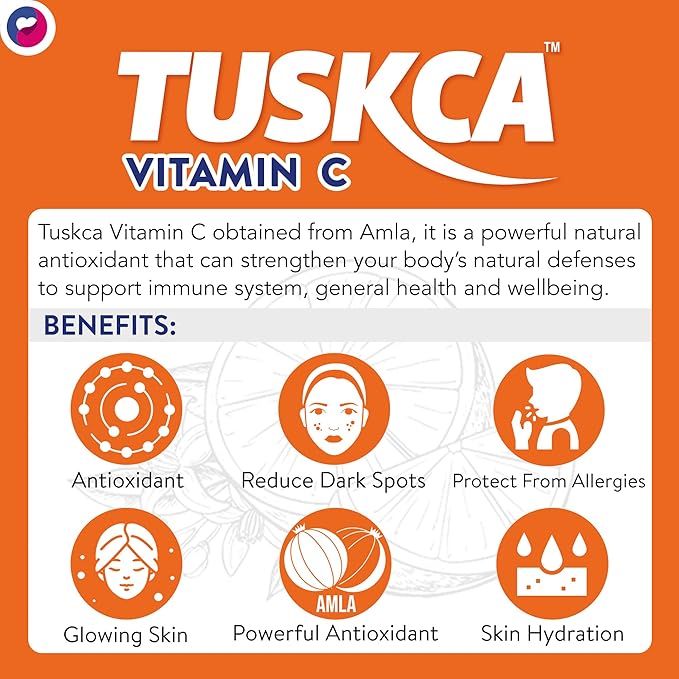 Tuskca Vitamin C (1000 mg) is obtained from amla, making it a naturally sourced antioxidant. The antioxidant vitamin C is well known for fortifying your body’s immunity against free radicals. Vitamin C helps the absorption of non-heme iron, which is found in plant foods like leafy greens. Vitamin C promotes healthy, supple skin and gives it a glow. Tuskca Vitamin C effervescent tablets support the immune system, general health, and wellbeing.